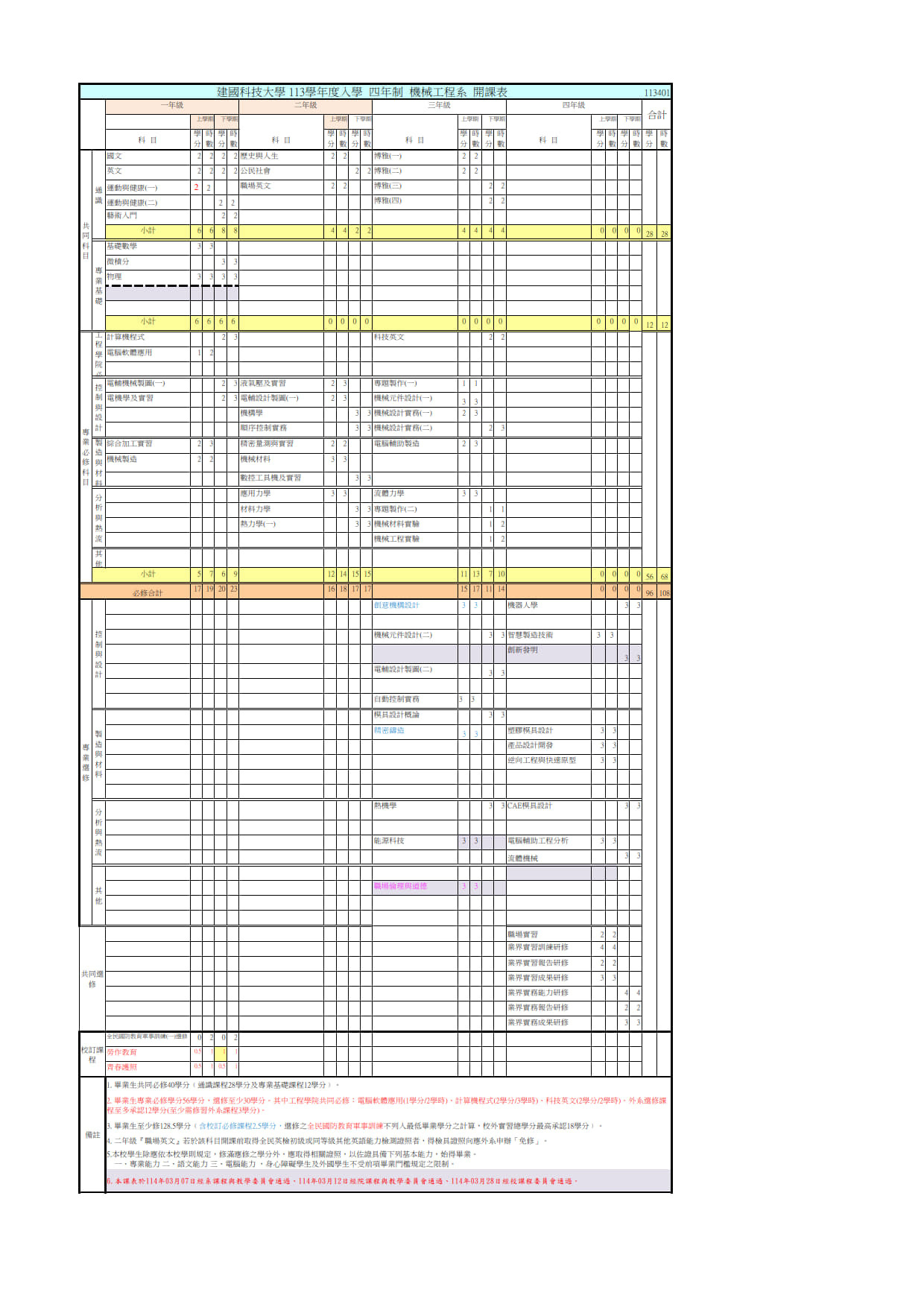 113學年度日間部四技機械工程入學開課表
